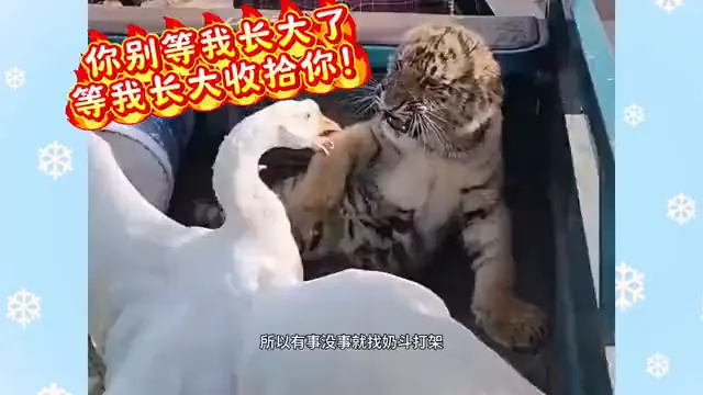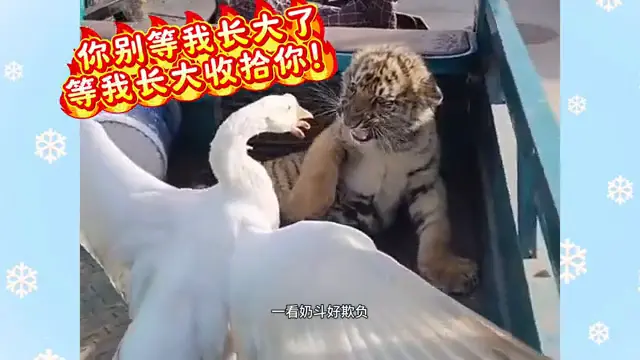 奶豆出身在山西省临汾动物园,是动物园的镇园兽,受到饲养员的偏疼,不错说是娇生惯养高出宠溺。甚至于身为东北虎的奶豆从小脾气就东谈主性化,神态呆萌又可儿。然则在大鹅眼里却成了呆傻,一看就很好欺侮。是以有事没事就找奶豆干架,将奶豆堵在墙下,莫得一点森林之王的风姿。